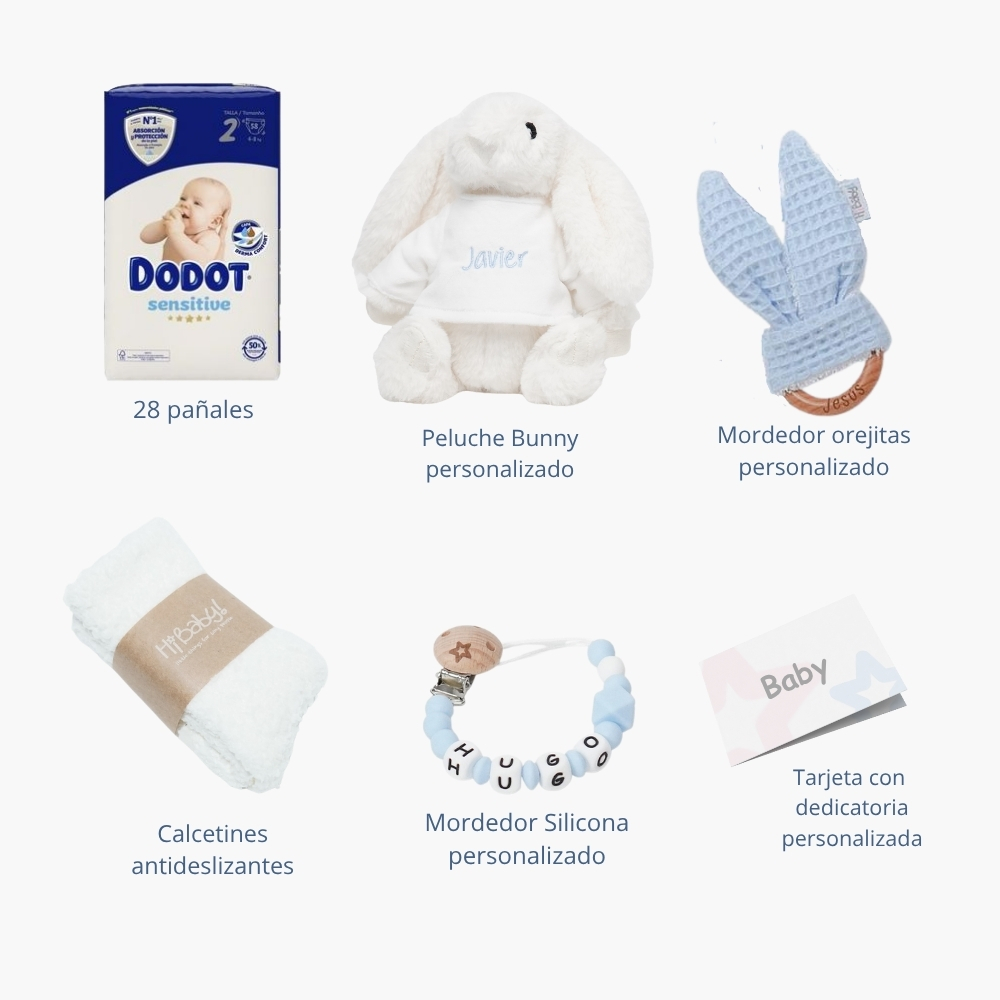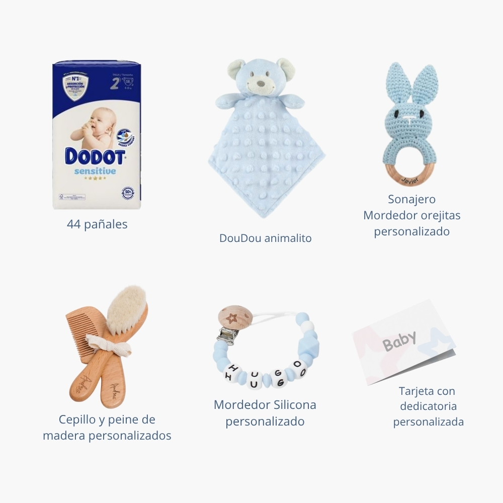 También incluimos una tarjeta de bienvenida personalizada con el nombre del bebé y tu mensaje de felicitación.