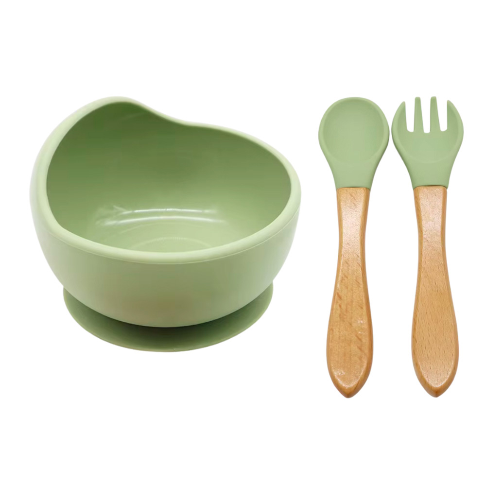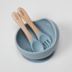 - Bol de silicona con ventosa antideslizante y juego de cuchara y tenedor de silicona con mango de madera, personalizado con el nombre del bebé.