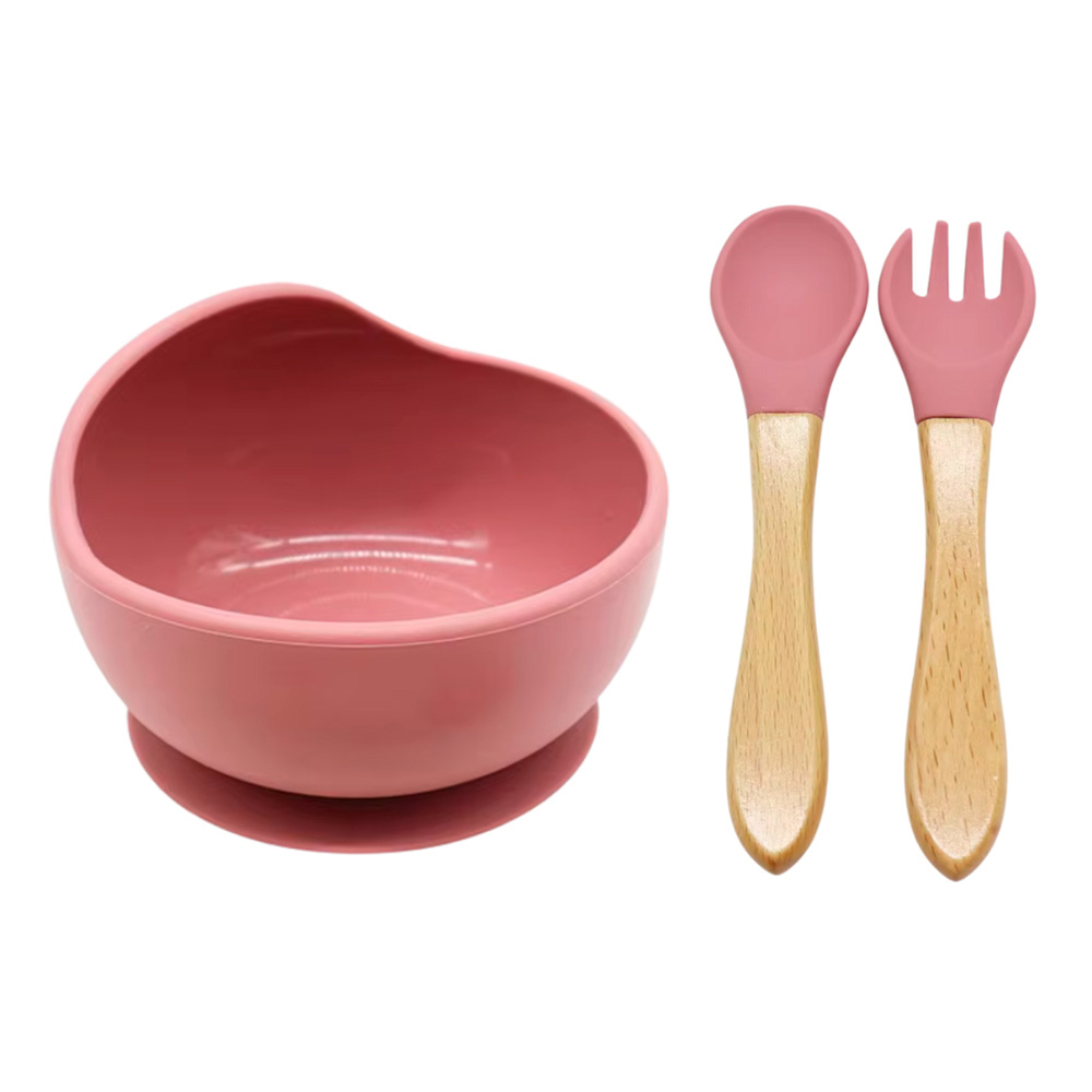 Bol de silicona con ventosa antideslizante y juego de cuchara y tenedor de silicona con mango de madera, personalizado con el nombre del bebé.
