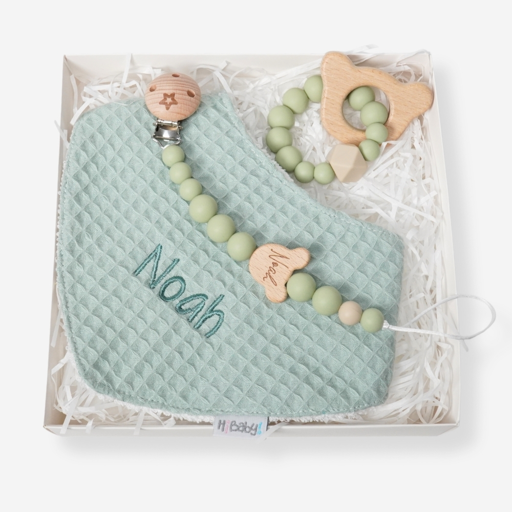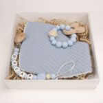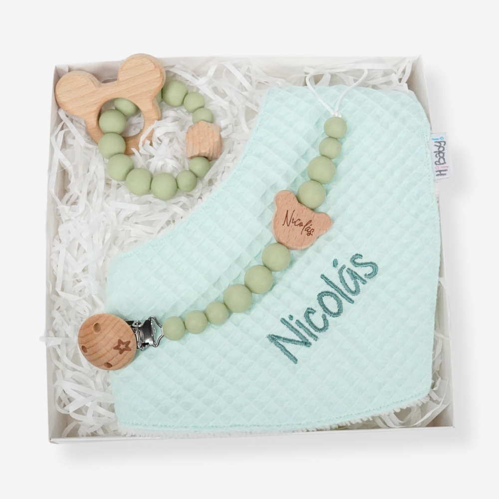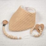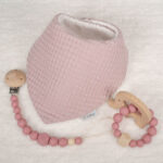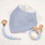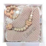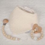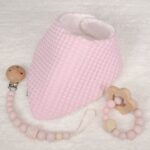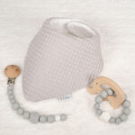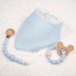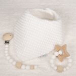 Precioso y práctico conjunto de bebé formado por bandana, sujetachupetes y mordedor
