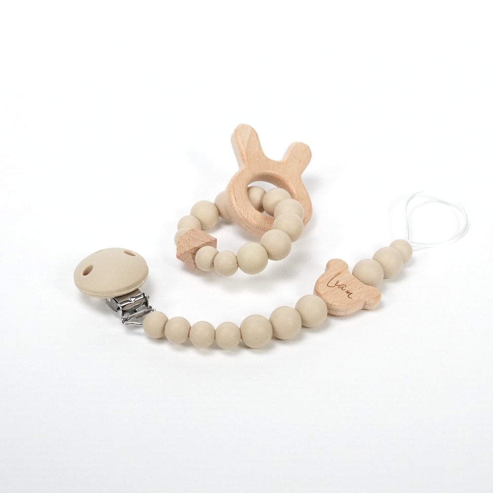 - Chupetero de silicona personalizado MOMMA, silicona de grado alimentario libre de BPA, PVC, Ftalatos, cadmio y plomo. Pinza de madera y cordón de nylon de alta resistencia, bajo normativa europea EN12586:2007 (A1:2011). El nombre se grabará en una figurita de madera integrada entre las bolitas de silicona.