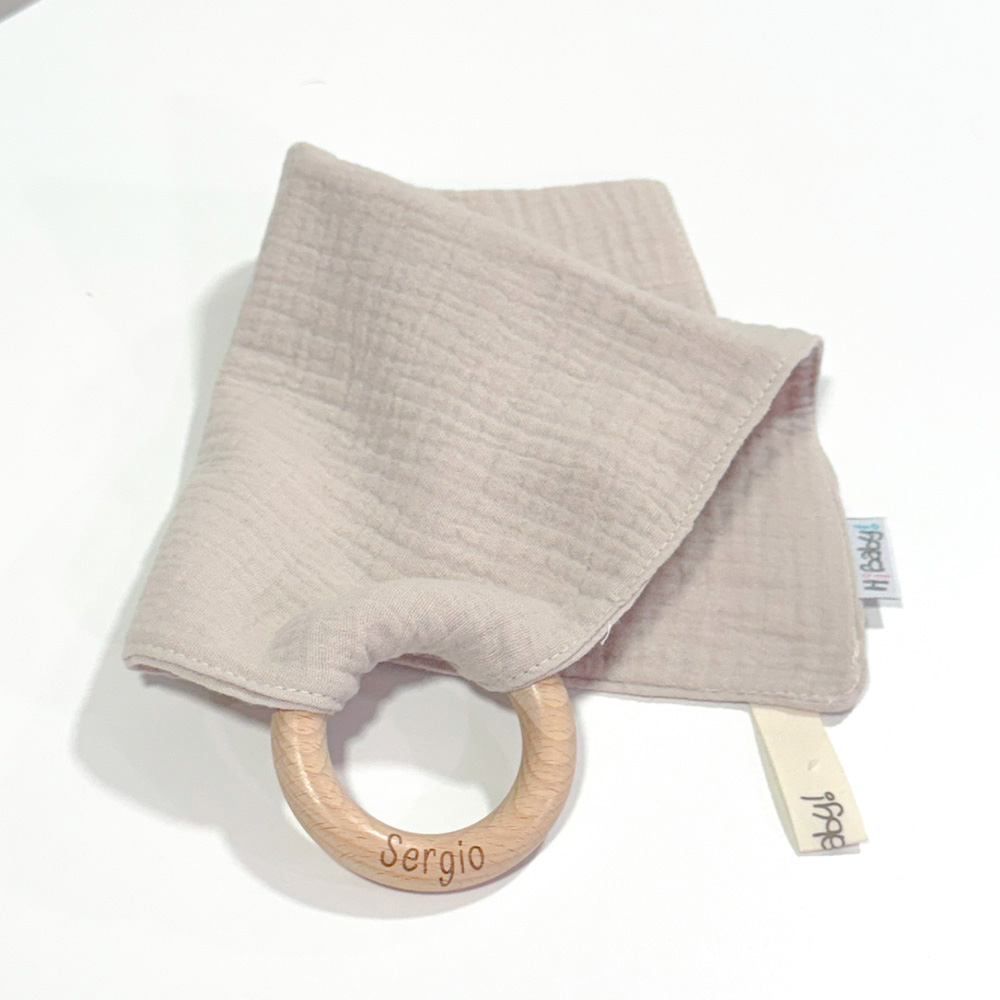 - Doudou muselina doble capa con aro de madera personalizado con el nombre del bebé, será uno de sus juguetes favoritos a modo de doudou, para los más pequeños es muy fácil cogerlo, agarrarlo con fuerza y manejarlo. También se puede sustituir el aro por el chupete, actuando como chupetero, calmará al bebé cuando empiece con la dentición. Medidas 30 x 30 cm.