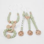 Sujetachupete de silicona personalizado, en el caso de que el nombre del bebé tenga seis o más letras, el nombre se grabará en una figurita de madera integrada entre las bolitas de silicona, por seguridad.Esto es debido al existir una normativa referente a la longitud del sujetachupete.