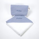 - Esta Capa de baño bebé personalizada está compuesta por rizo de algodón 100% y Waffle.