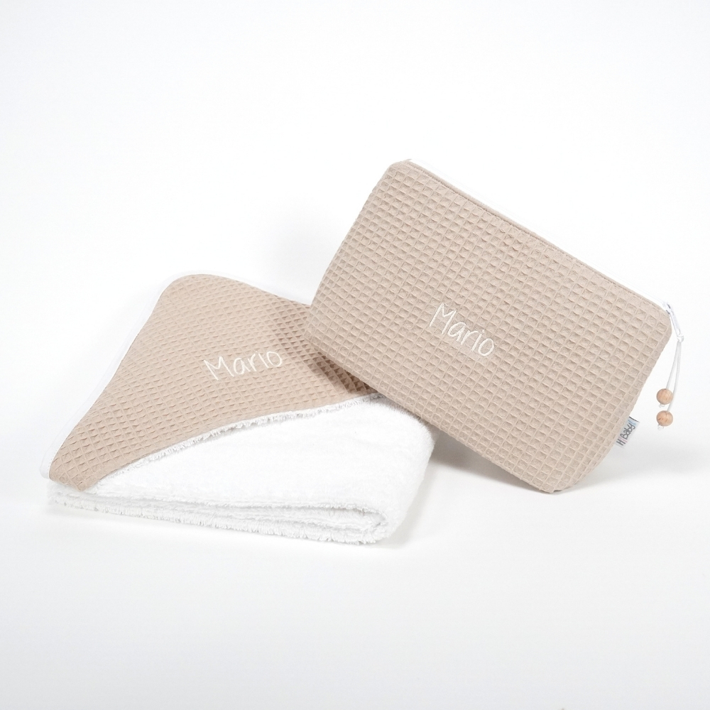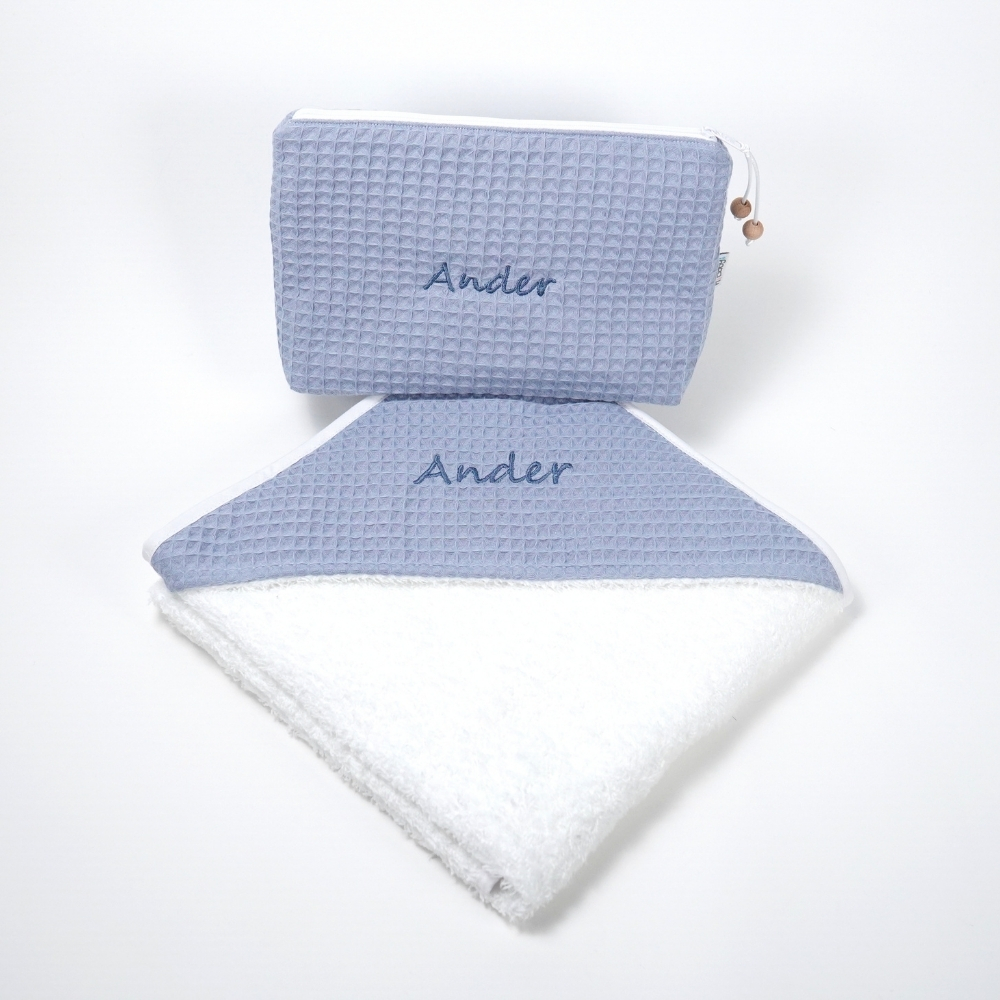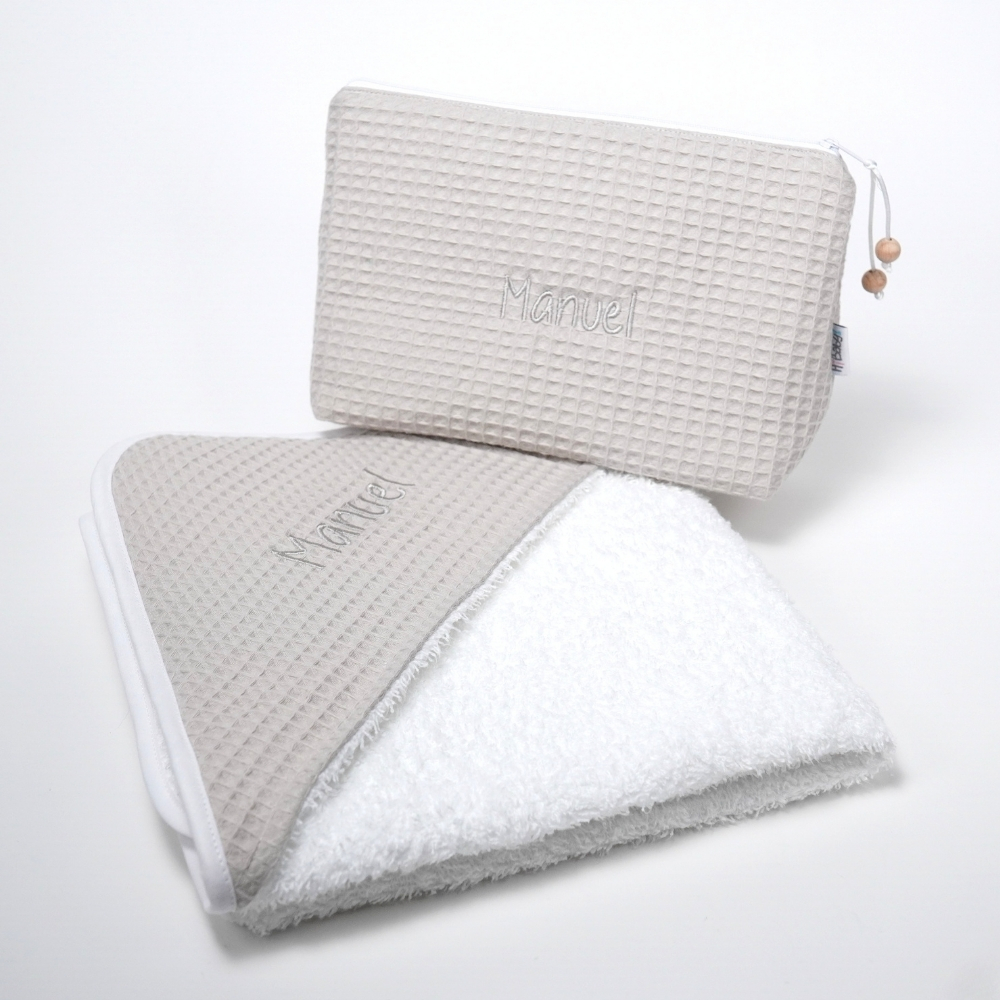 Esta capa de baño y neceser WAFFLE están compuestos por rizo de algodón 100% y Waffle en lo que respecta a la Capa y el Neceser es de algodón Waffle.