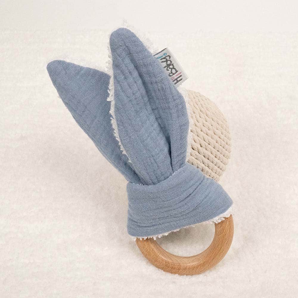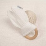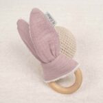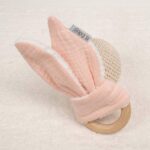 - Mordedor orejitas de muselina algodón y madera natural de haya, personalizado con el nombre del bebé.