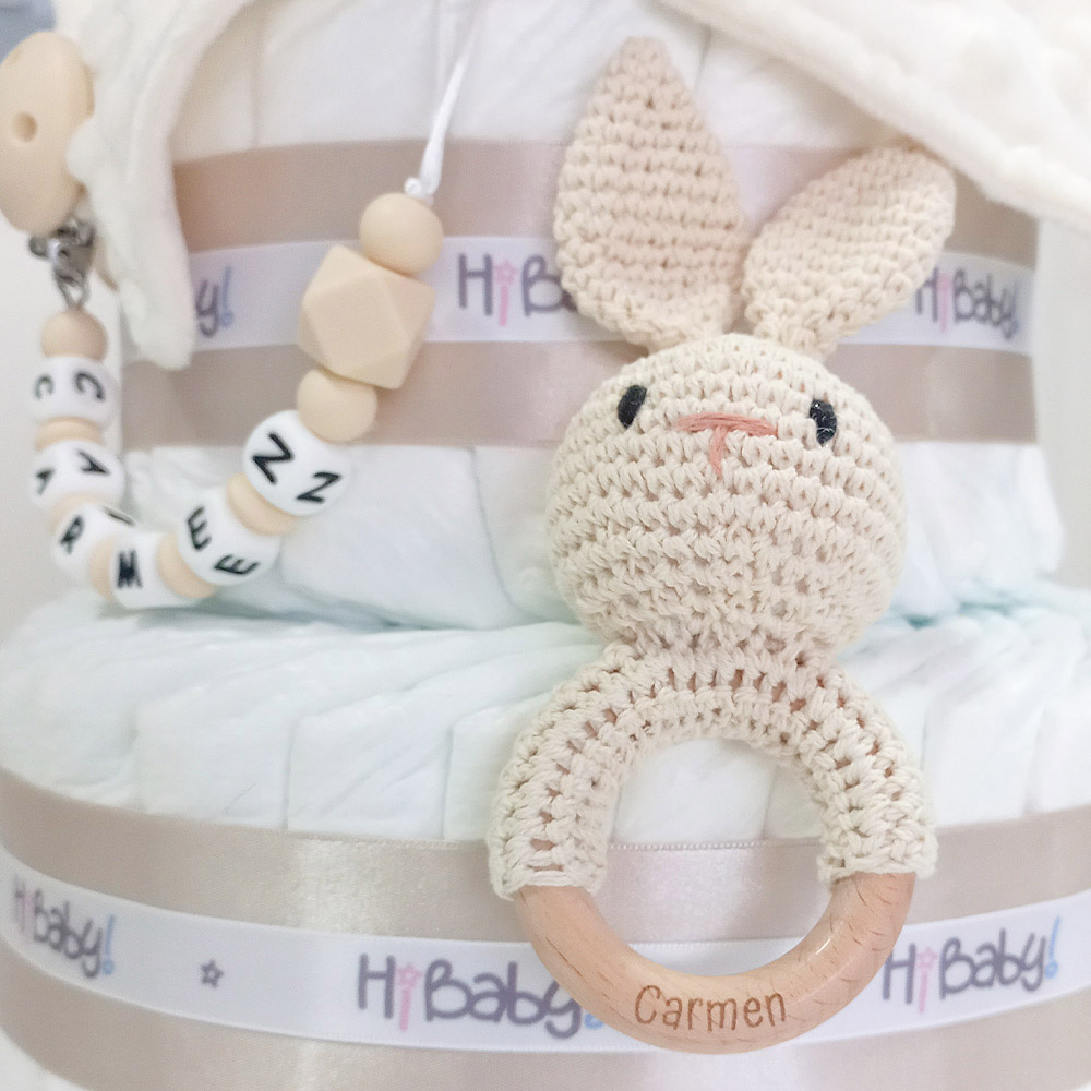 Sonajero mordedor orejitas de crochet y madera natural de haya, pèrsonalizado con el nombre del bebé.