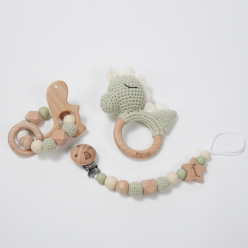 - Sonajero/mordedor Dino personalizado de crochet y aro de madera de haya personalizado con el nombre del bebé.