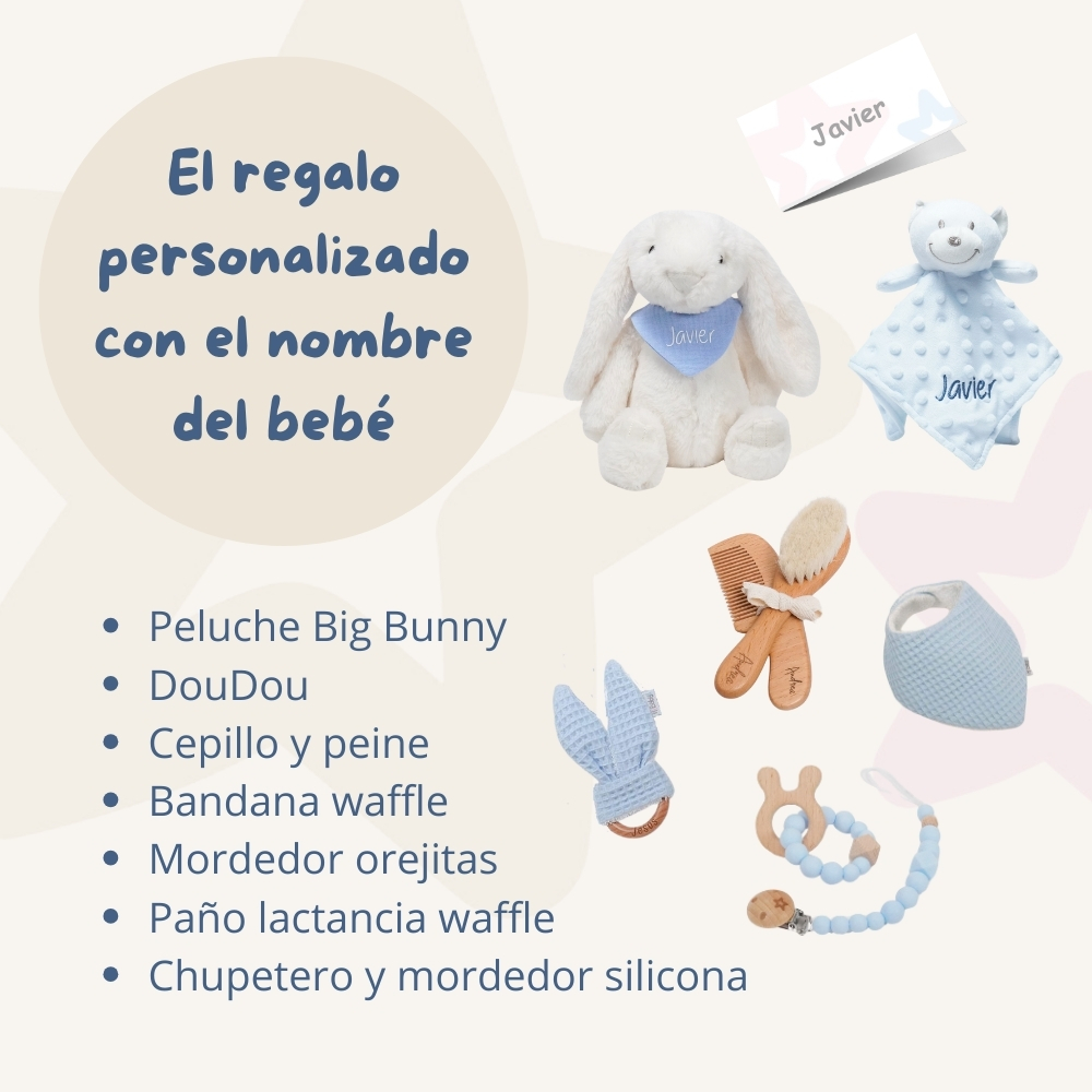 - Peluche conejito de 28cm marca Artesavi., con bandana personalizada con el nombre del bebé. Peluche principal conejito con bandana personalizada, hecho a mano y confeccionado utilizando únicamente materiales de máxima calidad certificado según normativa Europea EN71 & ASTM F963 garantizando la total seguridad para los pequeños, peluche exento de tintes tóxicos y elementos peligrosos
