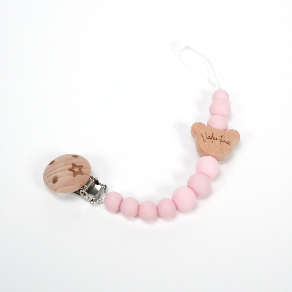 - Sujetachupete de silicona personalizado MOMMA, silicona de grado alimentario libre de BPA, PVC, Ftalatos, cadmio y plomo. Pinza de madera y cordón de nylon de alta resistencia, bajo normativa europea EN12586:2007 (A1:2011). Debido a esta normativa de seguridad relativa a la longitud del sujetachupete, en el caso de que el nombre del bebé tenga siete o más letras, el nombre se grabará en una figurita de madera integrada entre las bolitas de silicona.