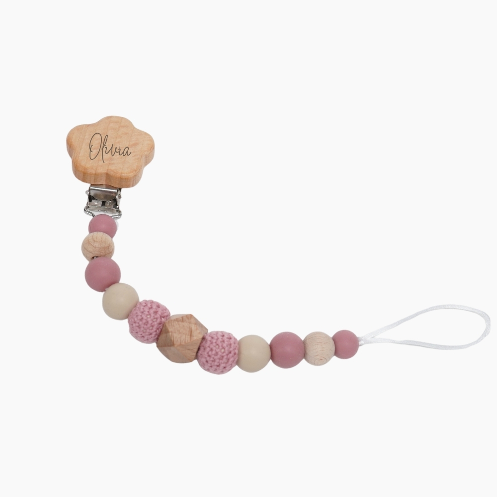 ✨ Fácil de lavar y mantener - Chupetero de silicona y crochet con pinza de madera natural de haya, personalizado con el nombre del bebé. Bolas de silicona alimentaria 100%. Realizado siguiendo la normativa Europea de Seguridad EN-12586.