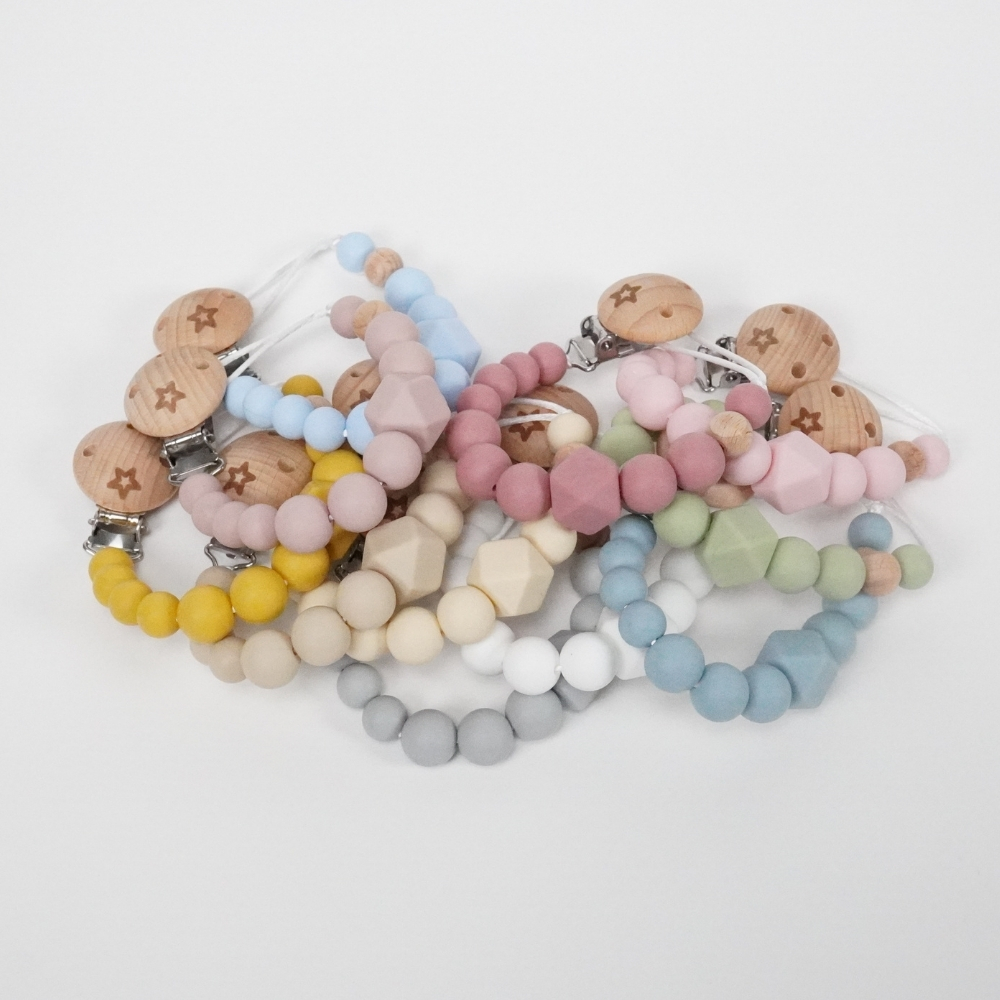 - Sujetachupete de silicona personalizado MOMMA, silicona de grado alimentario libre de BPA, PVC, Ftalatos, cadmio y plomo. Pinza de madera y cordón de nylon de alta resistencia, bajo normativa europea EN12586:2007 (A1:2011). Debido a esta normativa de seguridad relativa a la longitud del sujetachupete, en el caso de que el nombre del bebé tenga siete o más letras, el nombre se grabará en una figurita de madera integrada entre las bolitas de silicona.