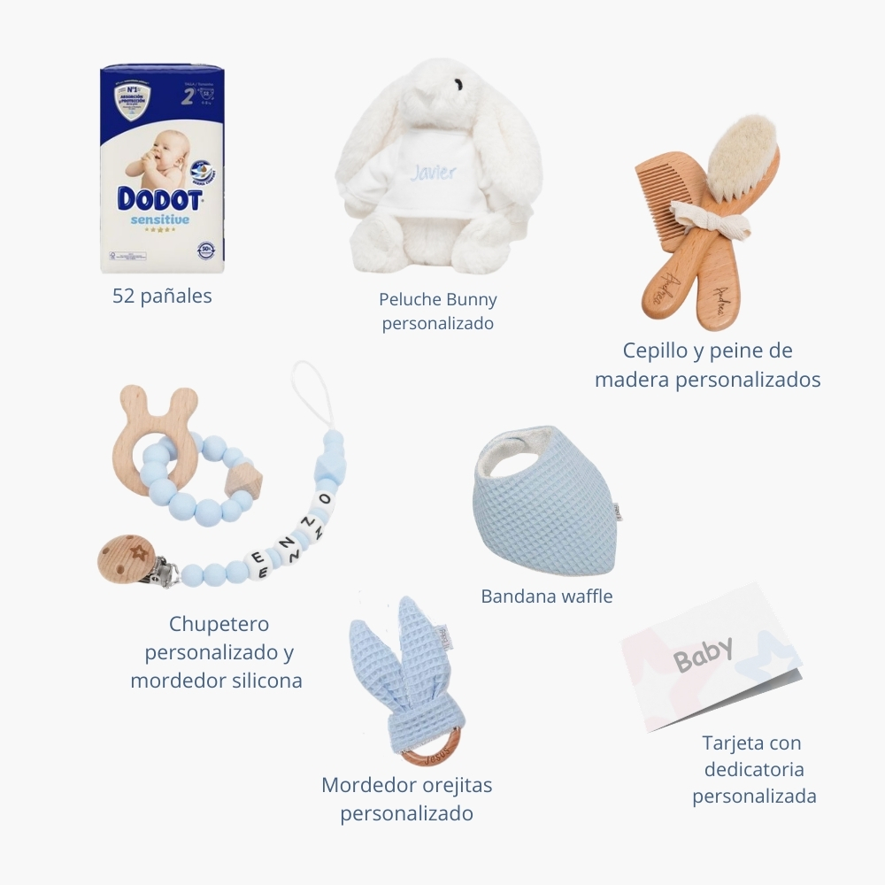 - Envuelto en papel de celofán transparente con lazo realizado en cinta especial Hi Baby.