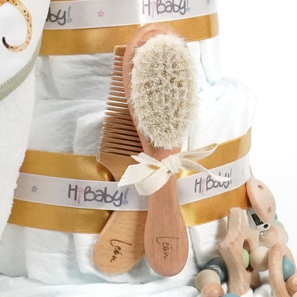 Peso del producto 200 g. - Chupetero de silicona exclusivo para las tartas Lion con figura de madera personalizada con el nombre del bebé, elaborado por Hi Baby