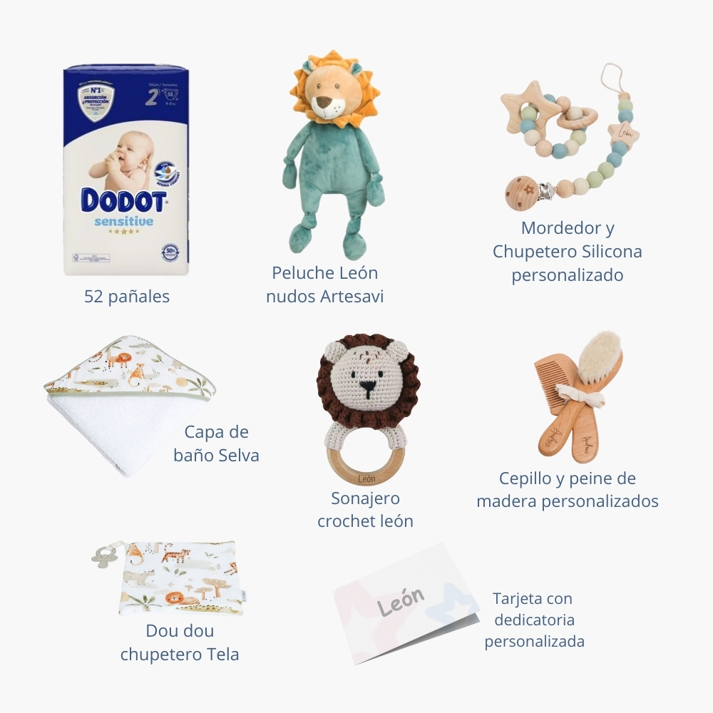 Especificaciones de los productos que se incluyen en esta tarta de pañales 3 pisos Baby Lion para recién nacido: