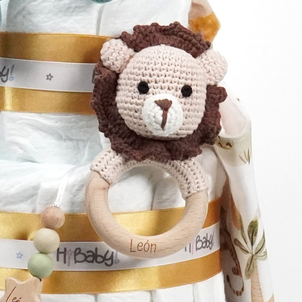 - Sonajero mordedor de crochet con figurita león y aro de madera personalizado con el nombre del bebé.